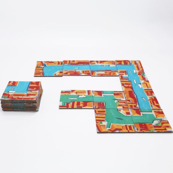 In Venice Connection i giocatori collaborano nella costruzione di un canale utilizzando tessere dritte e curve, con l’obiettivo di chiudere il percorso. Vince chi riesce a completarlo o chi dichiara correttamente che non è possibile farlo. Un gioco rapido, elegante e ambientato nella suggestiva Venezia.
